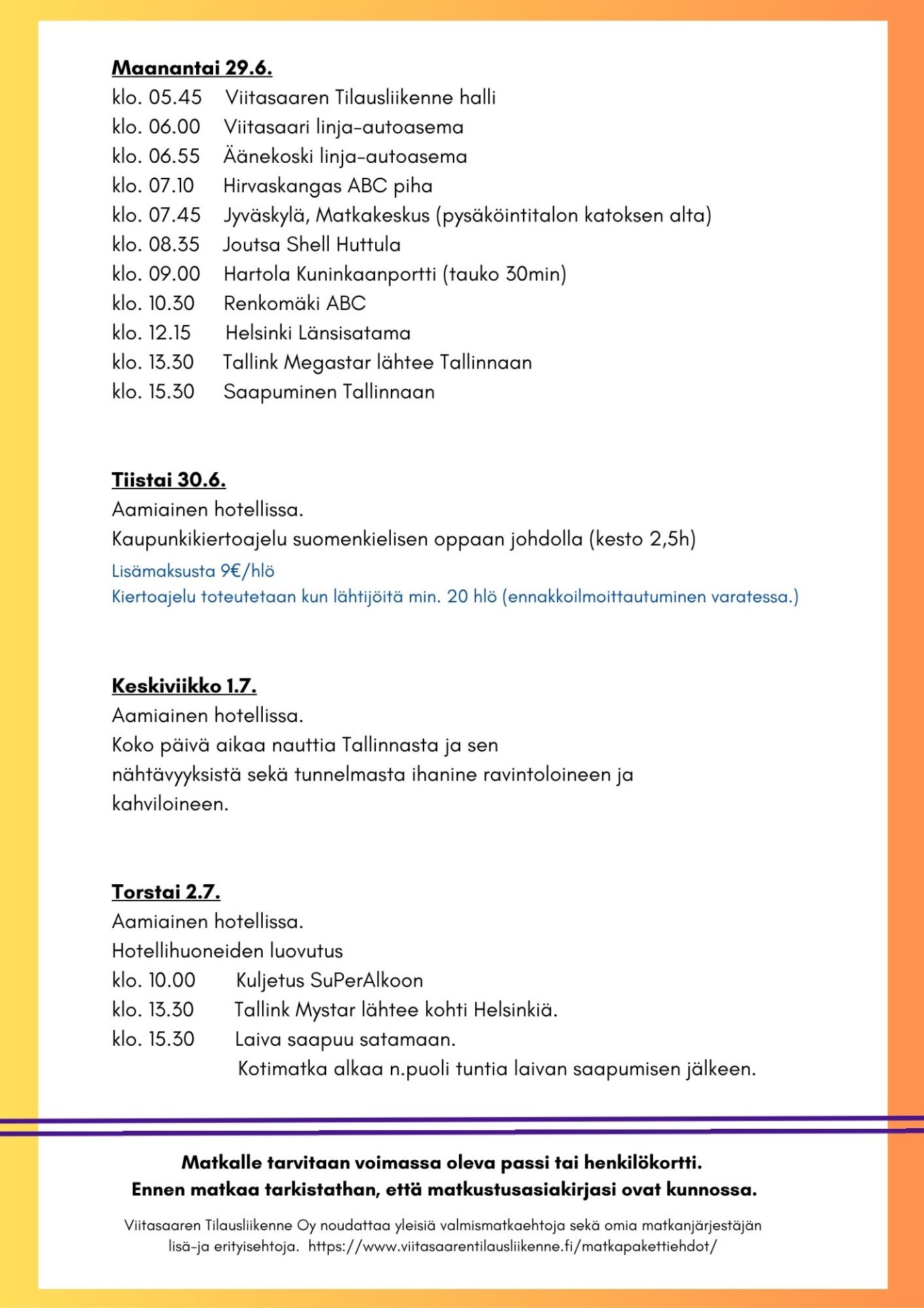 Matkalle tarvitaan voimassa oleva passi tai henkilökortti.